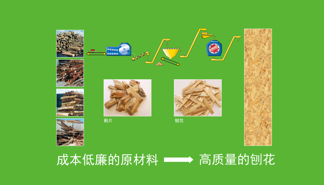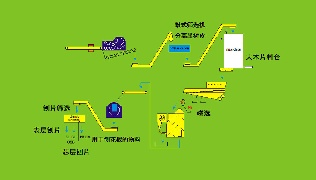 兩工段制備工藝是使用小徑級原木、枝椏材及加工剩余木料生產(chǎn)定向刨花板及超強(qiáng)刨花板所用的大尺寸刨花的工藝方案及設(shè)備。