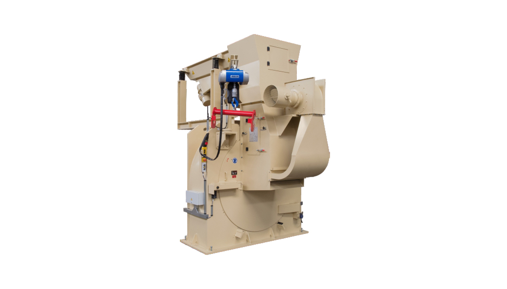 磁輥配有可以調(diào)節(jié)的排料點(diǎn),用來分離出鐵質(zhì)金屬,從上方下來的氣流橫向吹風(fēng),沿著可以調(diào)節(jié)的導(dǎo)流板的方向吹送木片偏離原來的路線,利用一個(gè)渦旋葉片形成的氣流,把木片送到環(huán)式刨片機(jī)內(nèi)部的切削室,物料內(nèi)的雜質(zhì)則落到前面的一個(gè)容器內(nèi)。
