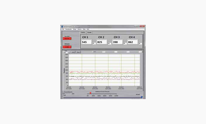 可以實時監(jiān)測記錄數(shù)據(jù),并生成張力-時間趨勢圖表統(tǒng)計數(shù)據(jù)實時連續(xù)進行更新和計算。所有的數(shù)據(jù)可以根據(jù)客戶需求進行文件保存。